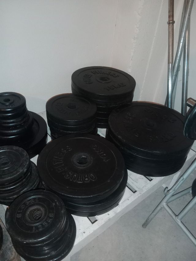 Discos disponibles: 4 discos de 20 kg 10 de 15 kg 12 discos de 10 kg 8 discos de 5 kg 2 discos de 4 kg 12 discos de 2 kg 6 discos de 1 kg a
