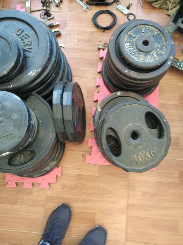 Detalles del productoDiscos de peso de hierro fundido usados, ideales para entrenamiento de fuerza. Están en buen estado, aunque muestran señales normales de uso.