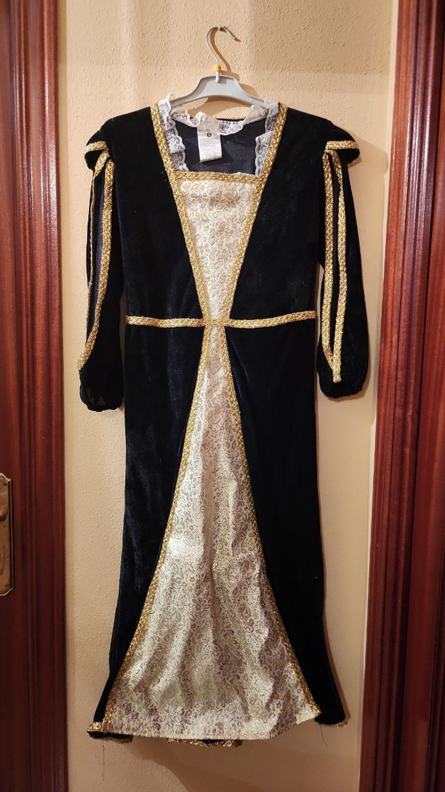 Detalles del productoDisfraz de época medieval, talla 3 niños. Utilizado una vez para hallowen con media cara pintada de calavera y media normal, para según qué lado se viese. Está en perfecto estado. 12 euros NEGOCIABLES.
