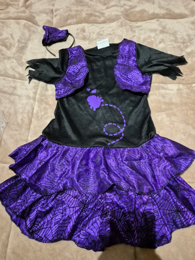 Disfraz de bruja para niña con detalles de telaraña. - Color principal: negro y morado. - Diseño con chaleco. - Falda con volantes. - Incluye diadema a juego.