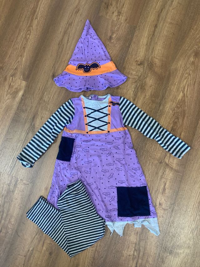 Detalles del productoDisfraz de brujita morado con detalles divertidos, ideal para Halloween o fiestas de disfraces. Incluye sombrero y mallas.