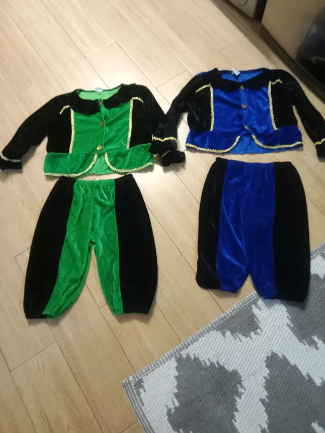 Detalles del productoConjunto de disfraces para carnaval, uno verde y negro y otro azul y negro. Talla para niños de unos 4 años.