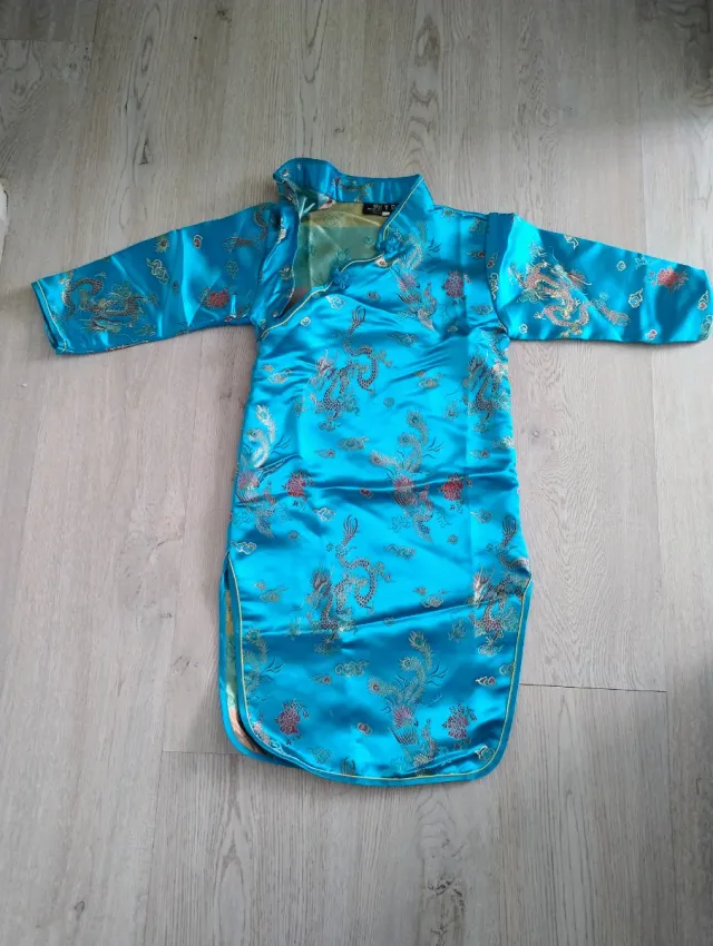 Disfraz de estilo oriental con estampado de dragones. - Color azul turquesa. - Tejido satinado. - Talla 9/10.
