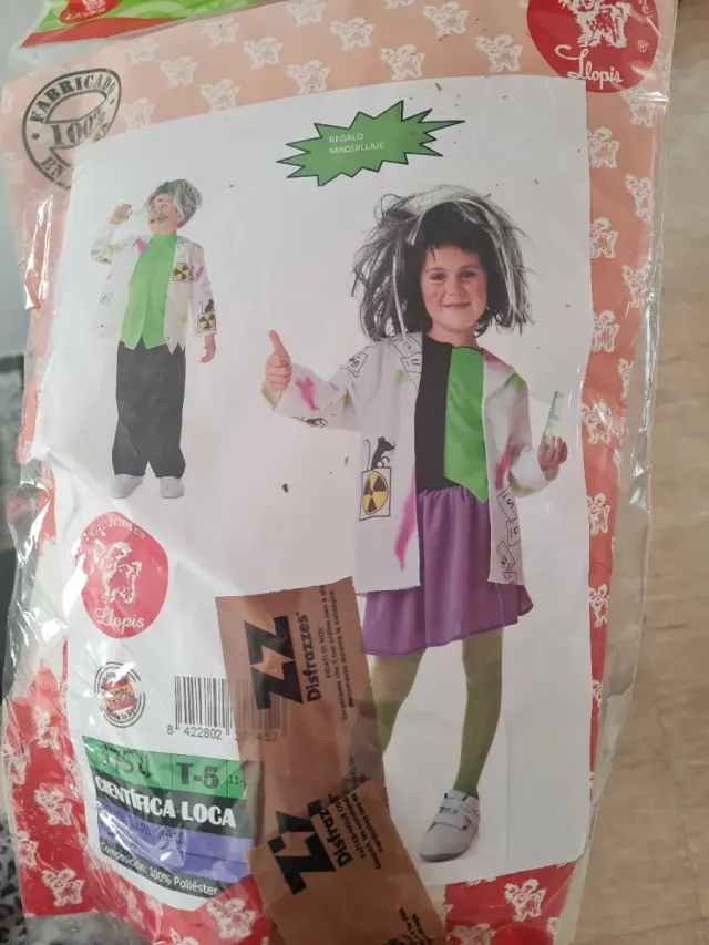Detalles del productoDisfraz de científica loca para niña, talla T-11-13. Incluye el traje y peluca.