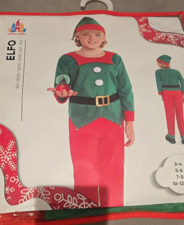 Disfraz de elfo para niño, usado una sola vez y en perfecto estado. - Talla 7-9 años. - Incluye gorro, parte superior y pantalón. - Diseño de elfo navideño.