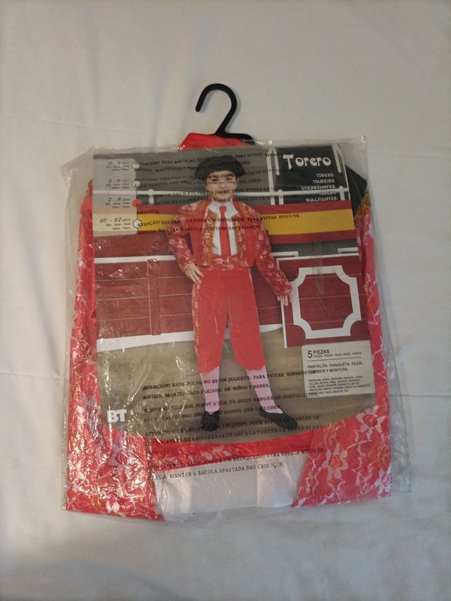 Disfraz de torero compuesto por pantalón, chaqueta, fajín, corbata y montera. Tala 7-9 años