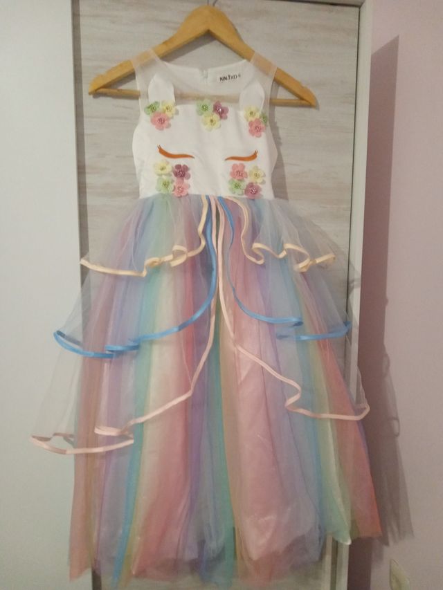 Detalles del productoPrecioso disfraz de Unicornio talla 140 con diadema. En la parte del pecho al plancharlo se quedó pegado pero yo le puse una camiseta a mi niña blanca debajo y pasó desapercibido jeje de ahí su precio
