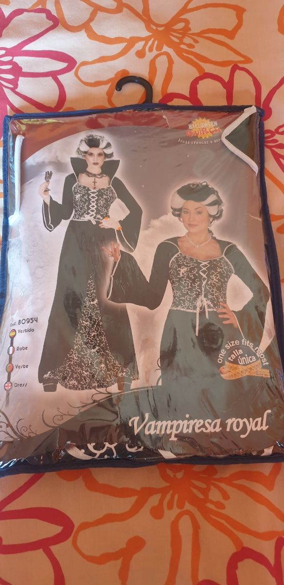 Detalles del productoDisfraz de Vampiresa . talla única. pero vale de la talla 40 a la 44. solo una puesta. con un antifaz que es una diadema y se sube para arriba sin necesidad de quitarlo. y una peluca gris y blanca. para darle el mismo toque de Vampira Clásica.