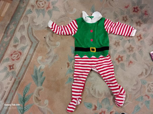 Disfraz de duende navideño para bebé. - Talla 12-18 meses. - Diseño de duende con traje de rayas rojas y verdes. - Cuello blanco y detalles de botones rojos.
