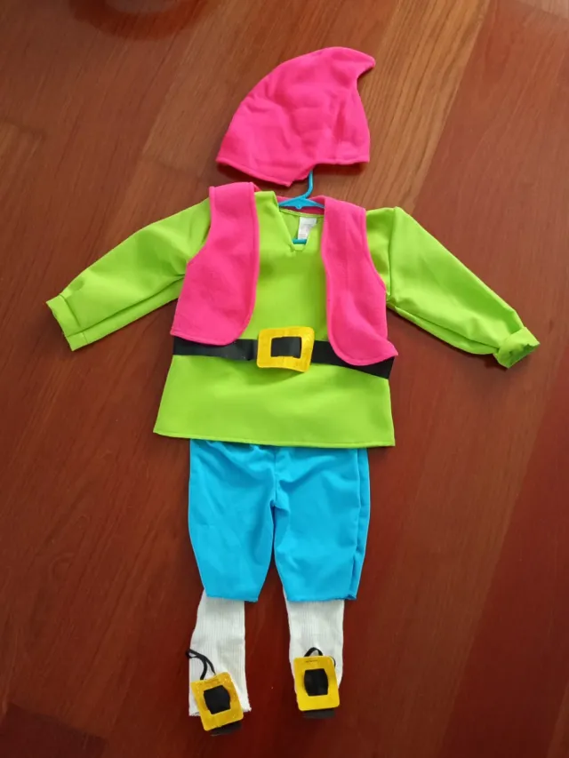 Detalles del productoDisfraz de enanito para niños pequeños. Incluye gorro, chaleco, cinturón y cubrebotas.