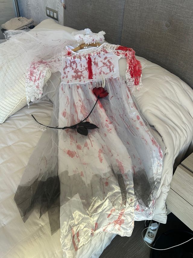 Detalles del productoDisfraz de novia muerta con temática de Halloween, salpicado de sangre. Incluye un velo con diadema a juego. Y una flor. Talla 7-9 años.