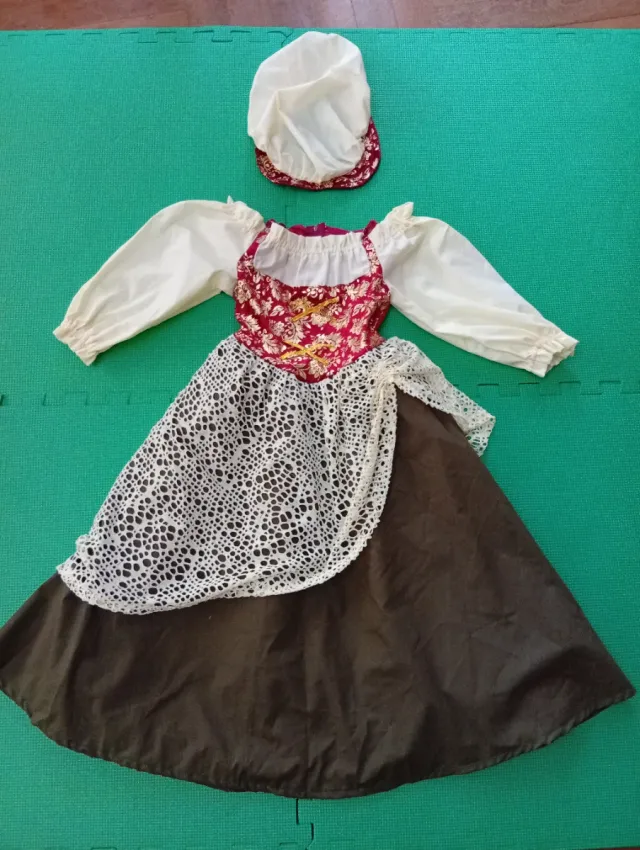 Detalles del productoDisfraz de mesonera para niña, talla 4. Incluye vestido y gorro.