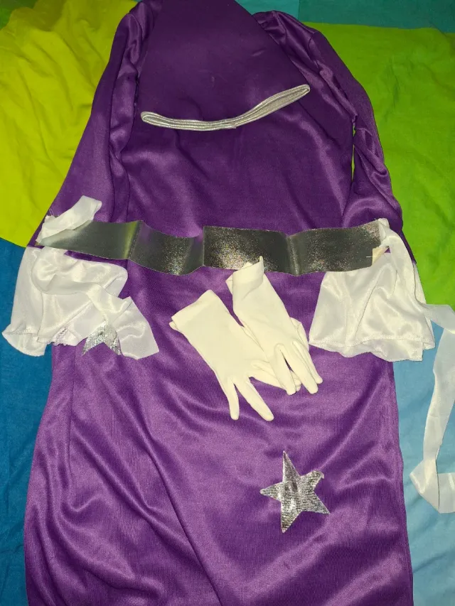 Disfraz completo con detalles brillantes. - Vestido morado. - Cinturón plateado. - Puños blancos. - Guantes blancos. - Estrellas plateadas decorativas.