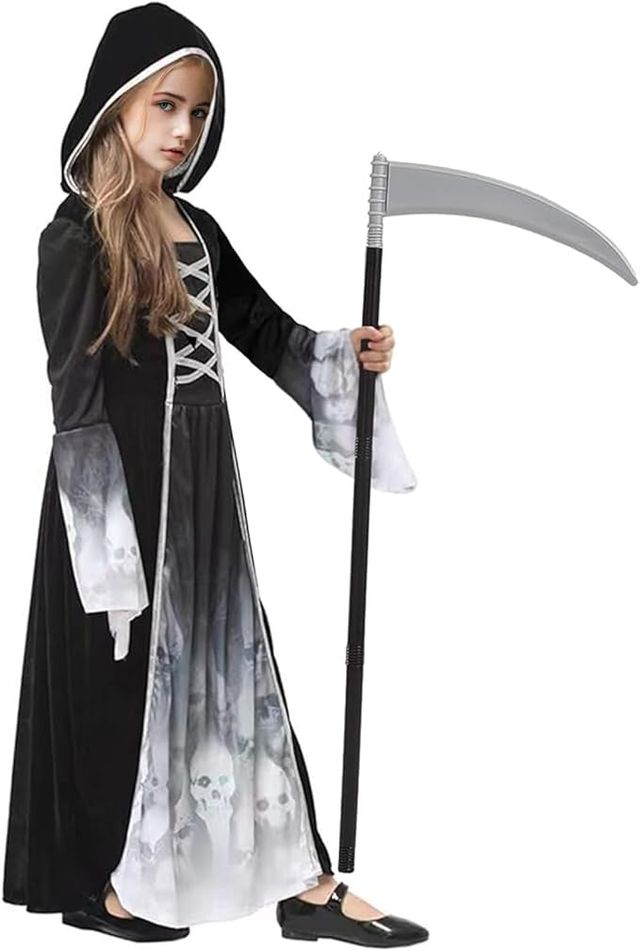 Disfraz de Grim Reaper Niña: Este conjunto de disfraz de la parca niño de Halloween consta de un vestido con capucha estampado de esqueleto y guadaña de juguete. Tu pequeña estará muy emocionada y no podrá esperar a Halloween después de disfrazarse