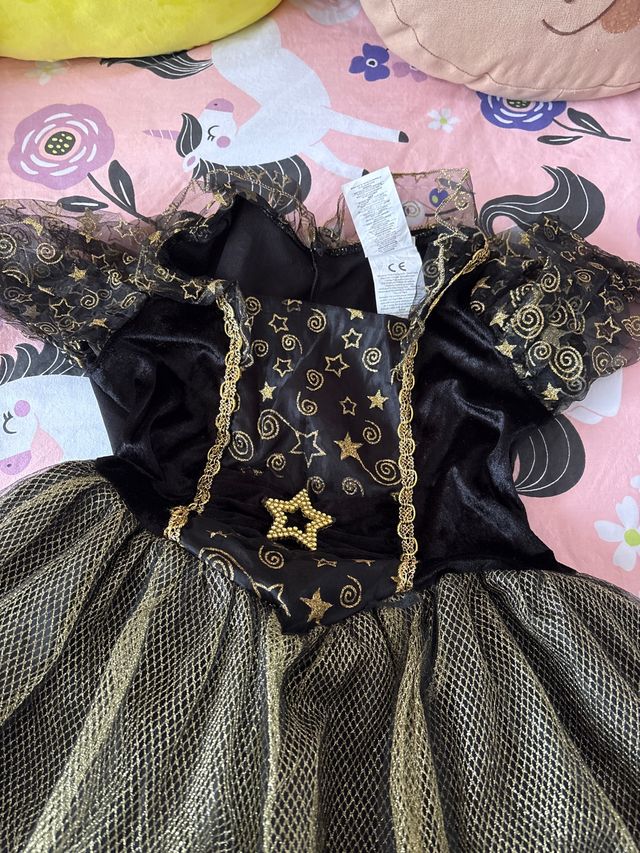 Detalles del productoDisfraz de bruja para niña con un diseño de estrellas.