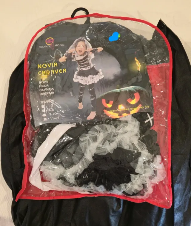 Detalles del productoDisfraz de Novia Cadáver para niña, ideal para Halloween o fiestas temáticas. Incluye vestido, falda, guantes y diadema.
