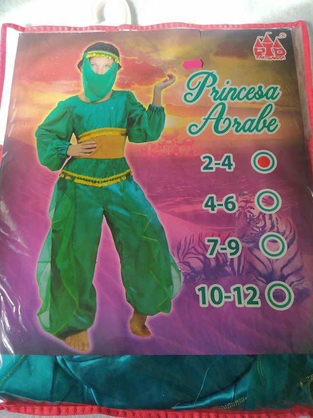 Detalles del productoNuevo a estrenar. Disfraz de princesa árabe de color turquesa. Ideal para disfrazarse de Jasmine, para fiestas de Moros y cristianos, o de las 1001 y una noches. El pañuelo de monedas suena.