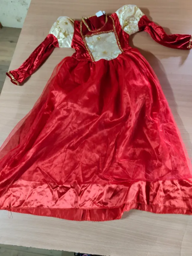 Disfraz de princesa en color rojo, ideal para fiestas o eventos. - Mangas abullonadas doradas con estrellas. - Detalle de escote dorado. - Falda larga y vaporosa.