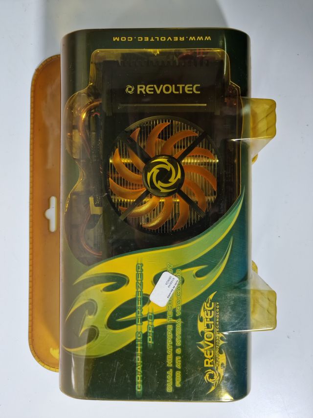Disipador Revoltec Graphic Freezer Pro (RS044/BG13277), ideal para tarjetas gráficas antiguas NVIDIA & ATI. Refrigeración eficiente y silenciosa gracias a su ventilador central y heatpipes de cobre.
