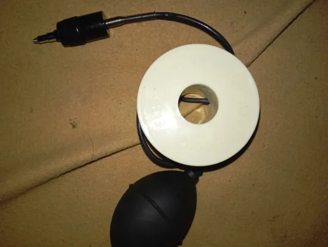 Disparador de aire con fuelle y carrete. - Fuelle de goma negro. - Carrete blanco. - Conexión metálica.