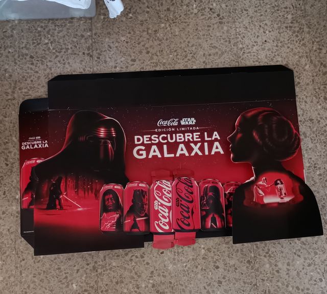 Detalles del productodisplay en forma de caja que mide 1 metro de largo x 60 cm de alto. kylo y leia se ensamblan mediante la parte de atrás a la caja, y las latas igualmente se ensamblan en las ranuras. He conseguido hacer una caja a partir de una caja de una pantalla de televisión, adaptada a las dimensiones para que vaya desplegado y no se estropee. La caja donde se envía es de gran tamaño (medidas: 120 x 70 x 16 cm) hago envíos por paq estándar (importe asegurado)