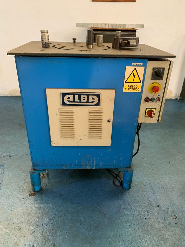 Dobladora de la marca ALBA, modelo COMBI 26/32. - Color azul. - Panel de control con interruptores y selector. - Placa con advertencia de riesgo eléctrico.