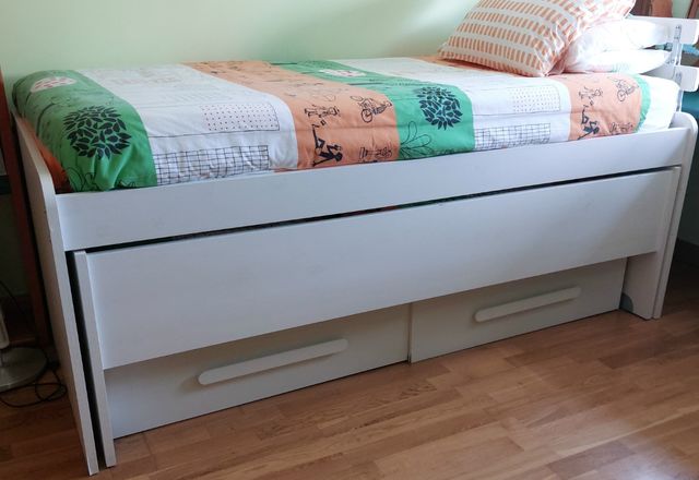 Detalles del producto-Mueble compacto de dormitorio infantil que incluye una cama doble y dos cajones grandes para almacenamiento.