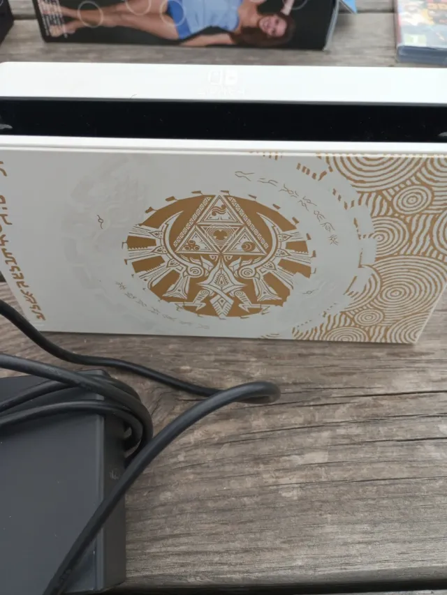 Detalles del productoBase de carga para Nintendo Switch OLED. Diseño blanco con detalles dorados.
