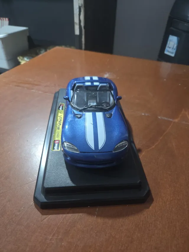 Réplica detallada del Dodge Viper de 1993. - Color azul metalizado. - Doble franja blanca en el capó y maletero. - Base expositora negra.