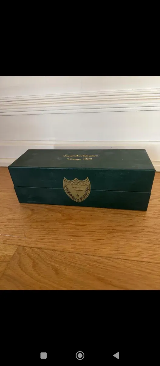 Elegante caja para botella de Dom Pérignon. - Color verde oscuro. - Detalle de escudo dorado con el logo de la marca. - Texto Dom Pérignon y Vintage 1993 en dorado.