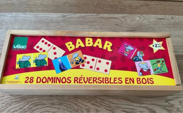 Detalles del productoJuego de 28 dominós reversibles de madera con personajes de Babar.