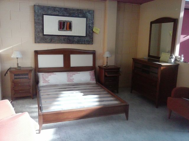 Detalles del productoDORMITORIO haya/cerezo NUEVO Para somier 150×190. Compuesto por cabecero, aro bañera con patas, comodín (ancho 120, fondo 48 y alto 90), 2 mesitas de ancho 45, fondo 40 y alto 68). Calidad macizos en haya y frentes en cerezo. Plafones del cabecero en piel vacuno beige y recambiables. Resto de tienda tras jubilación. Medidas del producto