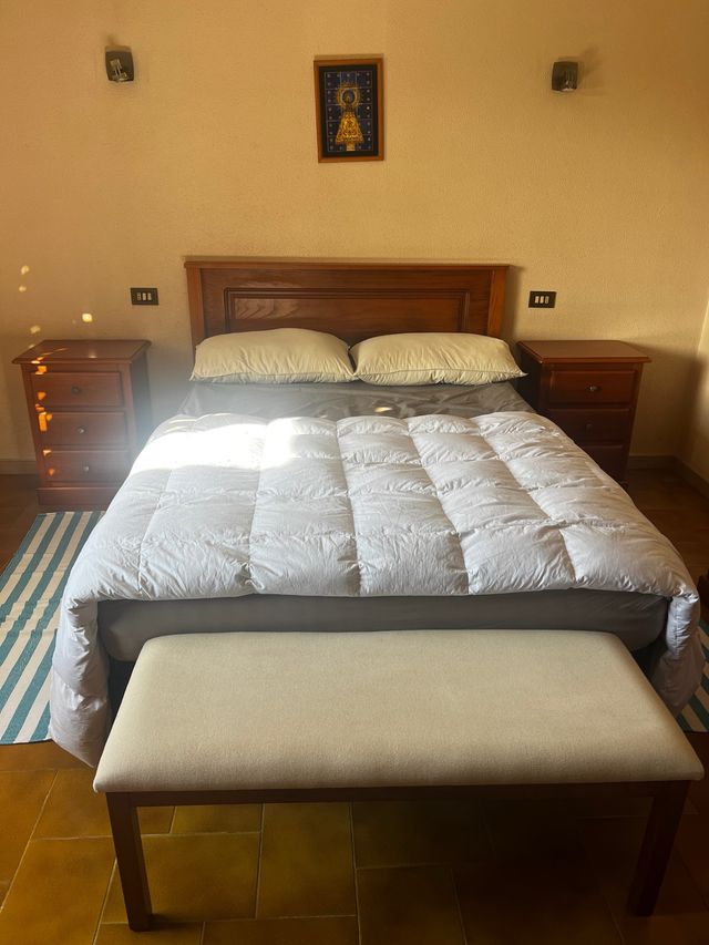 Conjunto de muebles de dormitorio de madera maciza. - Cama con cabecero. - Dos mesitas de noche con cajones. - Cómoda con cajones. - Armario