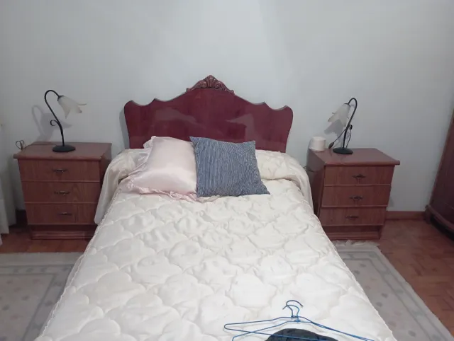 Detalles del productoSe vende conjunto de dormitorio que incluye una cama y dos mesitas de noche.