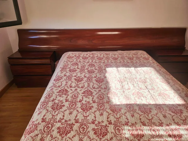 Detalles del productoConjunto de muebles de dormitorio en madera oscura, con un diseño elegante y moderno. De matrimonio. De 135.