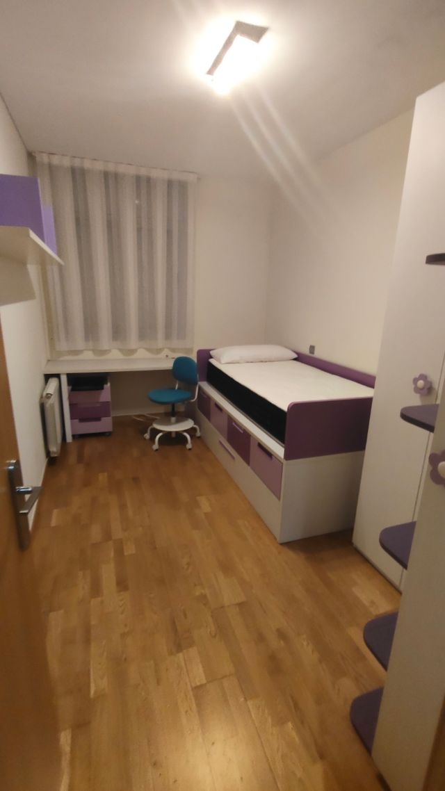 Conjunto de muebles para dormitorio infantil en tonos blancos y morados. - Cama con cajones. - Escritorio. - Estantería. - Silla de escritorio.