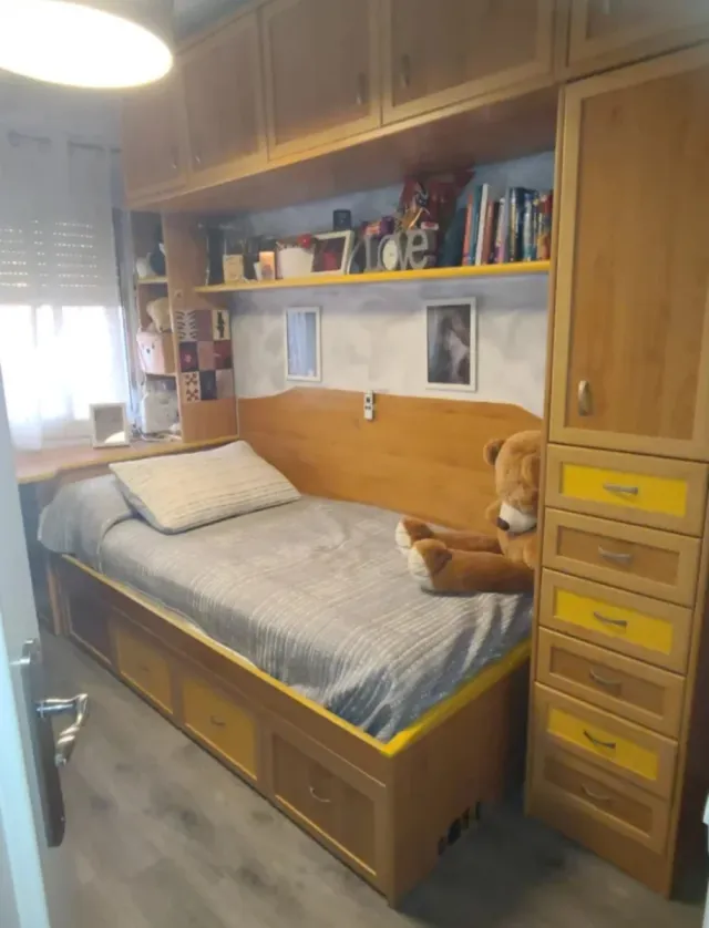 Conjunto de muebles para dormitorio juvenil. - Cama con cajones inferiores. - Armario alto con cajones. - Estantería. - Escritorio.