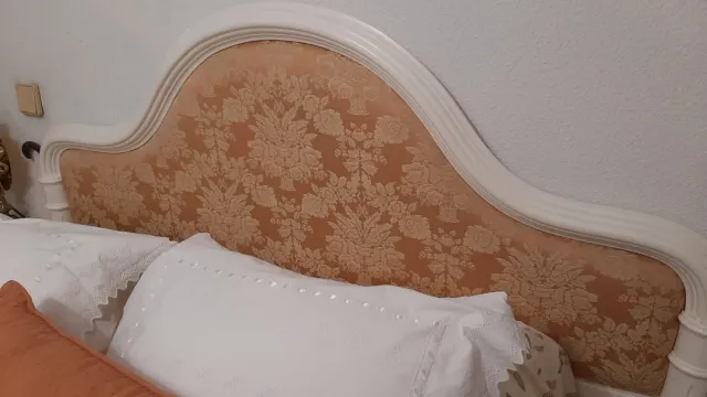 - Cama de matrimonio 135 cm en madera maciza lacada en blanco, tapizada con diseño floral.
