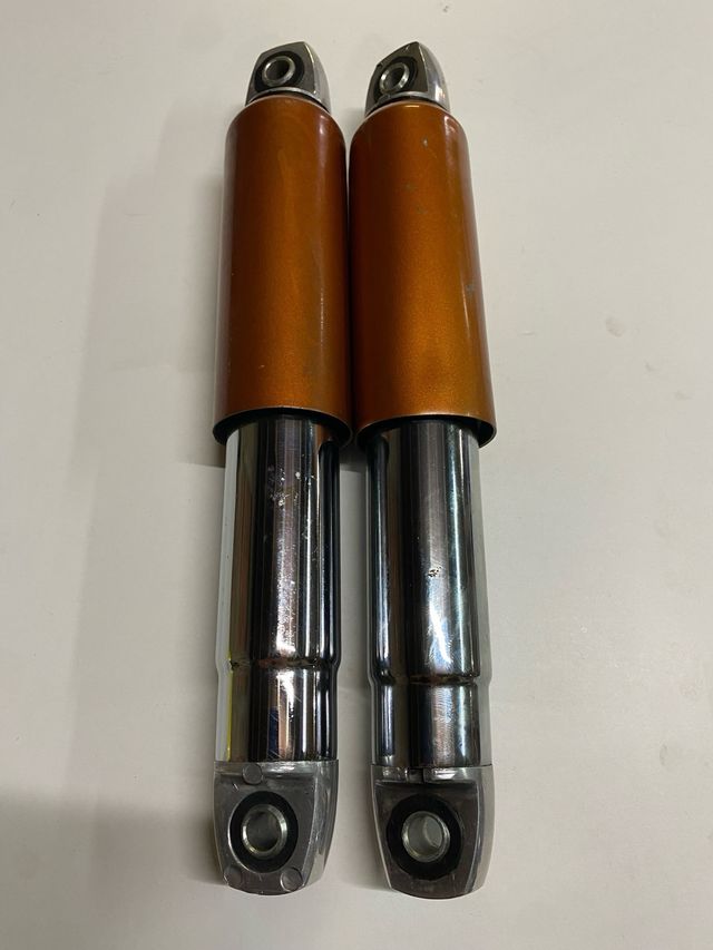 Detalles del productoDos amortiguadores ciclomotor de color marron metalizado, de 28,50 largo, agujero de 10 mm diámetro.