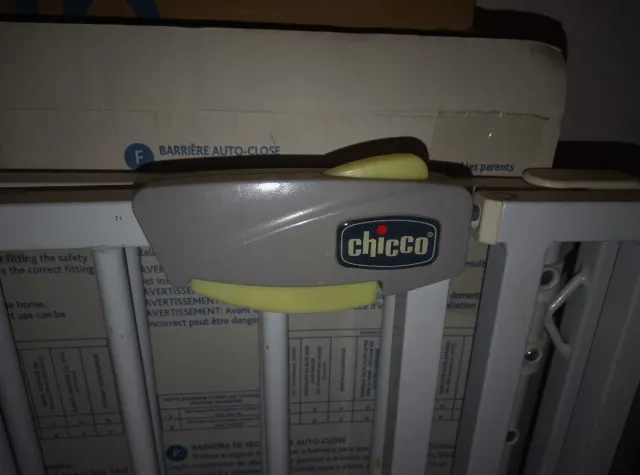 Detalles del productoBarrera de seguridad de la marca Chicco, ideal para escaleras y puertas.