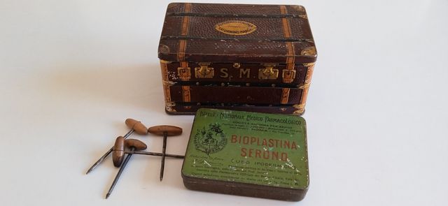Detalles del productoDos cajas metálicas antiguas y 4 barrenas de carpintería manuales (años 1930). Medidas caja mayor 13 x 8 x 7 cms. La caja pequeña mide 9,5 x 7,5 x 2 cms. Las herramientas de carpintería miden 6 cms. Si se hacen envíos