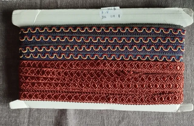 Detalles del productoAproximadamente 15 mts en total de cintas de pasamanería, una en color azul oscuro con teja y amarillo, la otra en color caldero/teja