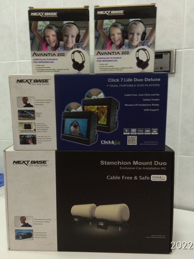 Detalles del productoPareja de DVD con soportes homologados y dúo de auriculares inalámbricos por infrarrojos con un canal de audio diferente para cada DVD. Pueden actuar cada DVD por separado o en conjunto, uno hace de receptor y el otro de emisor, independientemente de cual. También pueden funcionar cada uno por libre, un video diferente en cada monitor. Reproducen todos los formatos. Alimenta DVD, USB, etc. Precio algo negociable