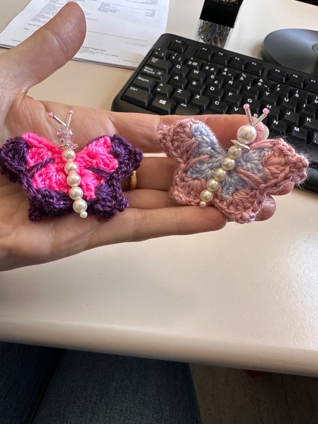 Conjunto de dos adorables mariposas hechas a mano con ganchillo. Perfectas como adorno o detalle.