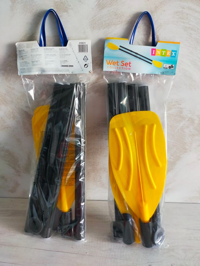 Detalles del productoDos pares de remos Intex, (cada set contiene 2 remos) ideales para actividades acuáticas. Son desmontables para facilitar su transporte y almacenamiento, nuevos a estrenar, en sus embalajes originales.