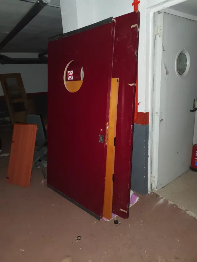 Puertas de color granate con una ventana circular. Una tiene una señal de prohibido fumar.