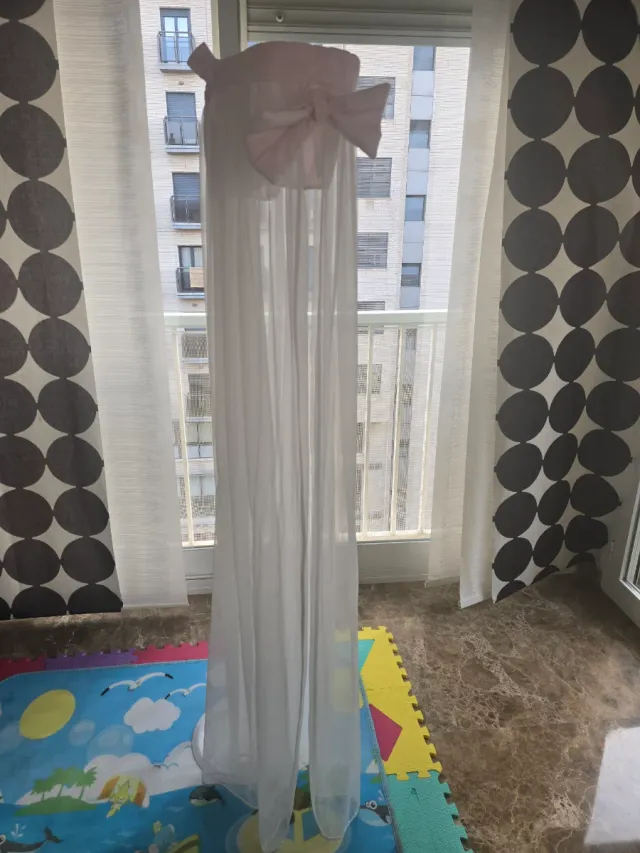 Dosel para cuna en color blanco, con un bonito lazo decorativo en color rosa. - Tela ligera y vaporosa. - Diseño elegante para la habitación del bebé.