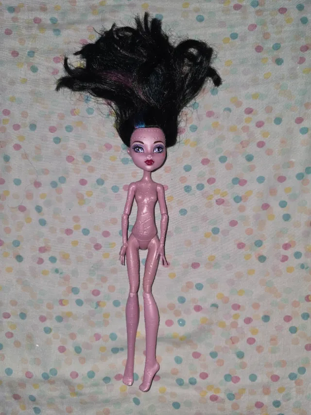 Muñeca Dracubeca de Monster High. - Cuerpo de color rosa pálido. - Cabello largo y oscuro con mechones morados y azules. - Maquillaje con sombras moradas y labios rojos.