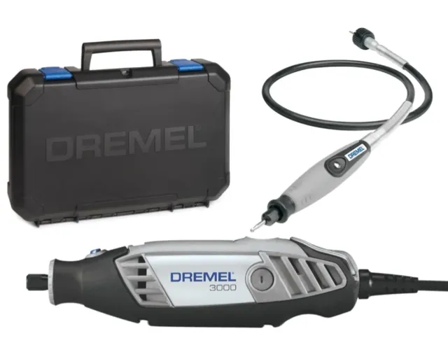 Detalles del productoMultiherramienta Dremel 3000 con motor de 130W. Incluye un maletín para guardarla y un accesorio de eje flexible.