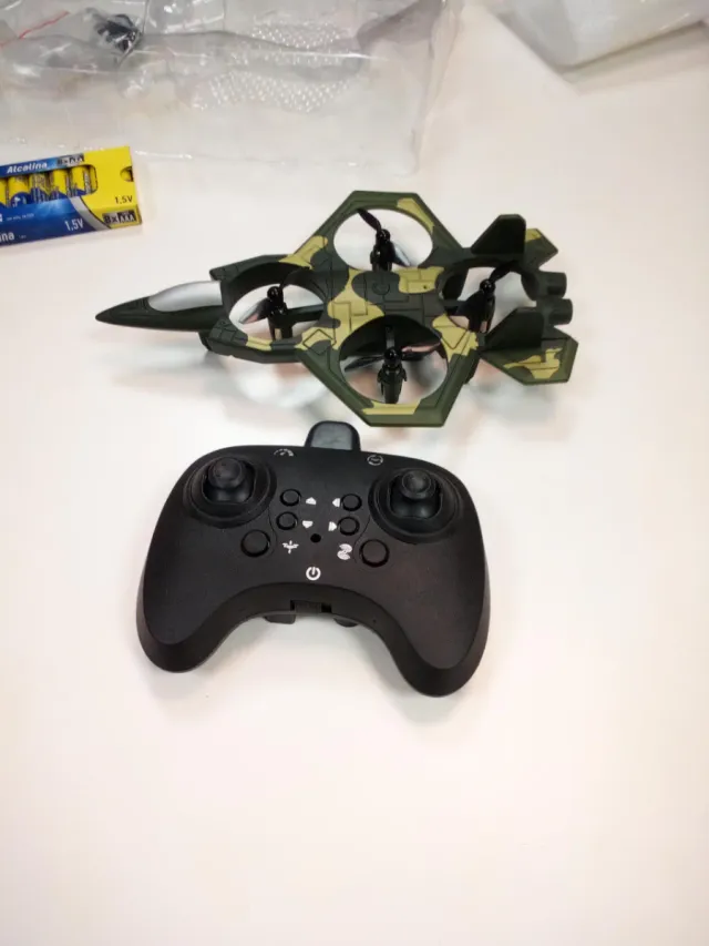 Dron con diseño de avión militar y mando a distancia incluido. Perfecto para iniciarse en el mundo de los drones. - Diseño camuflaje. - Mando ergonómico. - Hélices protegidas.
